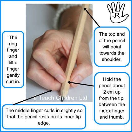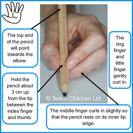 This is traditionally considered the most appropriate handwriting pencil grip for both left and right-handed writers. Holding the pencil between the thumb and index finger with pencil supported on the middle finger. The ring and little fingers are gently curled inwards. This gives an open wide web space which means the movement comes from the fingers.